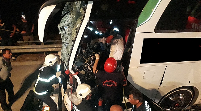 Alınan bilgiye göre, Kahramanmaraş-Gaziantep karayolunun 50. kilometresinde sabahın erken saatlerinde meydana gelen trafik kazasında, Mehmet Oral'ın (44) kullandığı 21 BH 963 plakalı yolcu otobüsü, aynı yönde giden sürücüsü belirlenemeyen 31 YS 476 plakalı tıra arkadan çarptı. Kazada, ağır yaralanan muavin Süleyman Dorudemir (25) kaldırıldığı hastanede kurtarılmayarak hayatını kaybetti. Yaralanan otobüs şoförü ile 25 yolcu Kahramanmaraş ve Gaziantep’teki çeşitli hastanelere kaldırılarak tedavi altına alındı.