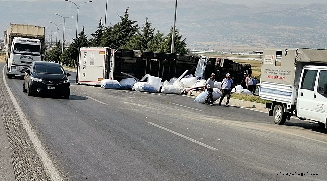 Kahramanmaraş’ta sürücüsünün direksiyon hakimiyetini kaybettiği tır devrilmesi sonucu maddi hasarlı trafik kazası meydana geldi.