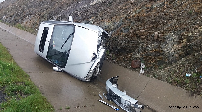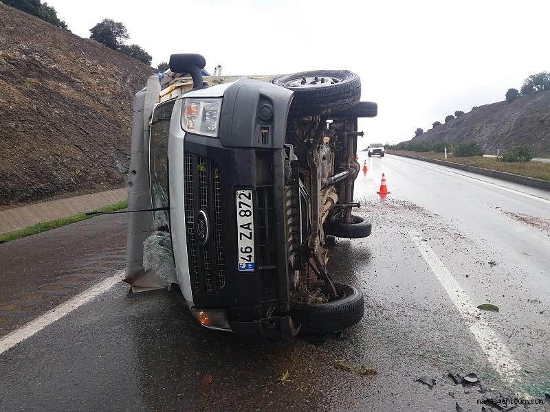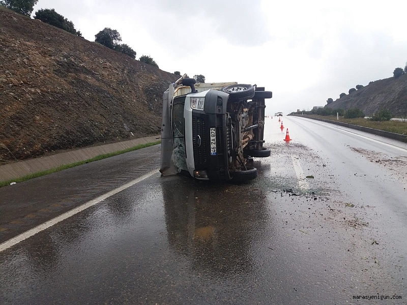 Kahramanmaraş’ta sabah saatlerinde etkisini artıran şiddetli yağmur nedeniyle bir otomobil yoldan çıktı, bir kamyonet devrildi.