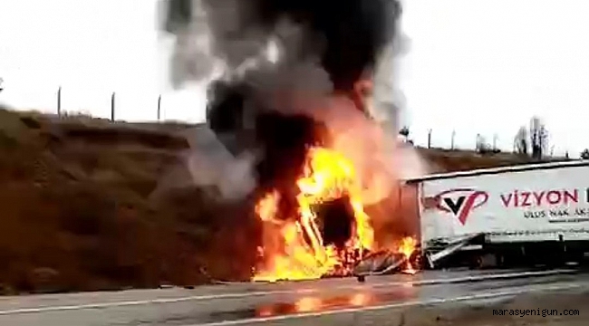 Kahramanmaraş’ta iki tırın çarpışması sonucu meydana gelen trafik kazasında bir tır sürücüsü hayatını kaybetti.Edinilen bilgiye göre kaza, Kahramanmaraş-Kayseri kara yolunda meydana geldi. Seyir halindeki 27 AFK 44 plakalı U.K. (36) idaresindeki tır ile 46 AHD 251 M.A. (38) idaresindeki tır çarpıştı. Çarpışmanın etkisiyle 46 plakalı tır yanmaya başladı. 27 plakalı tır sürücüsü kazayı hafif yarlı atlatırken, 46 plakalı tır sürücüsü hayatını kaybetti.Tır kazası sonrası çıkan yangın ise bir vatandaşın cep telefonu kamerası ile kaydedildi.Yangını görüntüleyen vatandaş, "İki tır çarpıştı. Tırın birinin şoförü yaralı çıktı ama diğeri herhalde çıkamadı. Yetişemedik. Gözümüzün önünde oldu ama galiba 46 plakalı tır sürücüsü sıkıştı kaldı" dedi.Kaza sonrası ekiplerin incelemesinin devam ettiği öğrenildi.