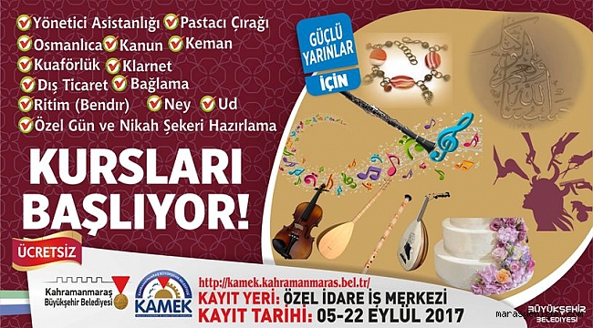 Kahramanmaraş Büyükşehir Belediyesi Kültür ve Sosyal İşler Dairesi Başkanlığı Mesleki Eğitim Şube Müdürlüğü bünyesinde (KAMEK) Meslek Edindirme ve Sanat Eğitimi Kurslarının kayıtları başladı.Necip Fazıl Kısakürek Kültür Merkezindeki kurs merkezinde 5-22 Eylül 2017 tarihleri arasında kayıt yapılacak olan Kamek kursları; Yazarlık Atölyesi, Aşçı Yardımcılığı, Türk Sanat Müziği Korosu, Türk Halk Müziği Korosu, Türk Halk Oyunları, Bağlama, Ahşap Boyama, Resim(Yağlı Boya), Kur’an-ı Kerim ve Osmanlıca alanlarında ücretsiz olarak halka hizmet verecek.Özel İdare İş Merkezinde kurs merkezinde 5-22 Eylül 2017 tarihleri arasında kayıt yapılacak olan Kamek kursları; Yönetici Asistanlığı, Pastacı Çırağı, Osmanlıca, Kanun, Keman, Kuaförlük, Klarnet, Dış Ticaret, Bağlama, Ritim(Bendir),Ney, Ud ve Özel Gün ve Nikah Şekeri Hazırlama alanlarında kayıt yaptıran kursiyerlere ücretsiz olarak kurs verilecek.