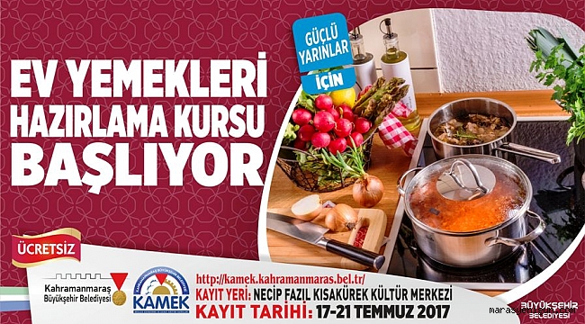 Kısa adı KAMEK olan Kahramanmaraş Büyükşehir Belediyesi Meslek Edindirme ve Sanat Eğitimi Kursları Ev Yemekleri Hazırlama kursu başlatıyor.Kahramanmaraş Büyükşehir Belediyesi Kültür ve Sosyal İşler Dairesi Başkanlığı Mesleki Eğitim Şube Müdürlüğü tarafından verilecek olan Ev Yemekleri Hazırlama Kursu kayıt tarihi 17 Temmuz 2017 tarihinde başlayarak 21 Temmuz 2017 tarihinde sona erecek.Katılımı ücretsiz olarak düzenlenen Meslek Edindirme ve Sanat Eğitimi Kursuna katılmak isteyen vatandaşların Necip Fazıl Kısakürek Kültür Merkezi’nde KAMEK bürosuna müracaat etmeleri gerekiyor.