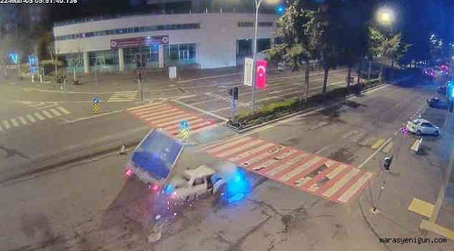 Kahramanmaraş'ta kamyoneti ile otomobilin çarpıştığı kazada 1 kişi hayatını kaybetti, 4 kişi yaralandı. Otomobilin çarpışmanın ardından alev aldığı kaza anı şehir güvenlik kameralarına yansıdı.Kaza, sabah saatlerinde Dulkadiroğlu ilçesi Azerbaycan Bulvarı Büyükşehir Belediyesi hizmet binası önünde meydana geldi. M.K. idaresindeki 46 BE 137 plakalı kamyonet, belediye kavşağı istikametine seyir halindeyken, Sandalzade Bulvarı'ndan Belediye Kavşağı istikametine giden Muharrem Eser idaresindeki 46 HR 958 plaka sayılı otomobil ile çarpıştı. Çarpışmanın etkisiyle 46 HR 958 plakalı Tofaş marka otomobil alev aldı. İhbar üzerine bölgeye çok sayıda sağlık ekibi ve polis sevk edildi. Ekiplerce araçtan çıkarılarak hastaneye kaldırılan sürücü Muharrem Eser, yapılan tüm müdahalelere rağmen hayatını kaybetti.Kazada yaralanan S.B, K.K, I.M. ile kamyonet sürücüsü M.K. hastaneye kaldırılarak tedavi altına alındı.Öte yandan kaza anı şehir güvenlik kamerası tarafından saniye saniye kaydedildi. Kazada kavşağa giren otomobil ve kamyonetin çarpışması, otomobilin alev alıp yanması görüntülerde yer aldı.Kazayla ilgili soruşturma sürüyor.