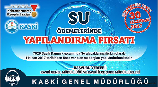 Vatandaşların 30 Haziran 2017 tarihine kadar KASKİ Genel Müdürlüğüne ve İlçe Müdürlüklerine müracaat etmeleri halinde peşin, 6,9,12 ve 18 taksit imkânlarından dilediğini seçebilecek ve su borçlarını ödeyebileceklerdir.Taksitle ödemek isteyenler 6,9,12 ve 18 eşit taksitte ödeme seçeneklerinden birini tercih etmeleri gerekmektedir. Bu borçların da faizleri silinecek olup taksit süresine göre hesaplanan Yurt İçi Üretici Fiyat Endeksi aylık değişim oranları ile bulunacak tutarı ikişer aylık dönemler halinde ödenecektir.Vatandaşların su borçlarını ödemelerinde büyük kolaylık getiren bu düzenlemeden faydalanmaları çok önemlidir. Ödemeleri peşin yapmaları halinde ise fer’i alacaklar yerine Yurt İçi Üretici Fiyat Endeksi aylık değişim oranları esas alınarak hesaplanacak tutarlar üzerinden ayrıca % 50 indirim yapılacaktır.