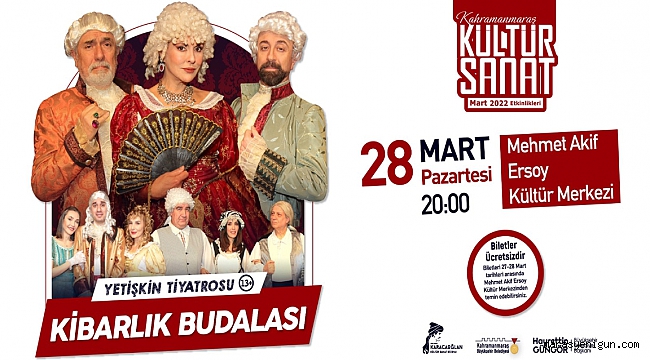 Büyükşehir Belediyesi Mart Kültür Sanat Etkinlikleri kapsamında 28 Mart Pazartesi günü ‘Kibarlık Budalası’ adlı yetişkin tiyatrosu sahnelenecek. Mehmet Akif Ersoy Kültür Merkezi’nde gerçekleştirilecek oyun saat 20.00’da başlayacak.Kahramanmaraş Büyükşehir Belediyesi Mart Kültür Sanat Etkinlikleri hız kesmeden devam ediyor. Etkinlikler kapsamında tiyatro gösterileri, konser, söyleşi ve konferans gibi pek çok program kültür sanat dostlarıyla buluşturuluyor. Bu kapsamda, 28 Mart Pazartesi günü (yarın) Fransız Yazar Moliere’nin unutulmaz eserlerinden ‘Kibarlık Budalası’ adlı yetişkin tiyatrosu sahnelenecek. Oyuncu kadrosu arasında Hakan Altıner, Göksel Kortay, Burçin Bildik, Kahraman Sivri, Anıl Yülek, Sadi Özen, Işık Selin Günçe gibi önemli isimlerin yer aldığı tiyatro oyunu Mehmet Akif Ersoy Kültür Merkezi’nde tiyatroseverlerle buluşacak. Saat 20.00’da başlayacak oyuna 13 yaş ve üzeri izleyiciler katılabilecek. Ücretsiz olarak sahnelenecek oyunun biletleri Mehmet Akif Ersoy Kültür Merkezi’nden temin edilebiliyor.Biletler Ücretsiz Olarak Temin EdilebiliyorKültür Spor ve Turizm Dairesi Başkanlığı’ndan etkinliklere ilişkin yapılan açıklamada, “Kültür Sanat Etkinlikleri kapsamında birbirinden eğlenceli ve öğretici programlar sanatseverlerle buluşturulmaya devam ediyor. Bu kapsamda, usta isimlerin rol aldığı ‘Kibarlık Budalası’ adlı tiyatro oyunu sahnelenecek. 13 yaş ve üzeri vatandaşlarımızın katılabileceği oyunun biletleri Mehmet Akif Ersoy Kültür Merkezi’nden ücretsiz olarak temin edilebiliyor” ifadelerine yer verildi.