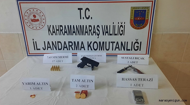 Edinilen bilgiye göre, Göksun İlçesine bağlı Tombak Mahallesinde ikamet eden C.K. (62), tanımadığı bir kişiden 1550 TL karşılığında yarım altın aldığını, ancak altının sahte olması nedeniyle jandarma ekiplerine ihbarda bulundu. Yapılan ihbar üzerine harekete geçen jandarma ekipleri, kamera kayıtlarının şüphelilerin kullandığı aracı tespit etti. Kiralık olduğu tespit edilen aracı, Kanlıkavak Mahallesi’nde yakalayan jandarma ekipleri, içerisinde bulunan 2 kişi gözaltına aldı.Jandarma ekiplerince araç içerisinde yapılan aramada ise, 2 adet cumhuriyet altını, 1 adet yarım altın, 2 adet sustalı bıçak, 1 adet kurusıkıdan çevirme tabanca, 17 adet 7.62 mm fişek ve araç içerisinde bulunan hassas teraziye el konuldu.Gözaltına alınan şüphelilerden S.Ç’nin çeşitli suçlardan 37 adet sabıka kaydı, M.K’nin ise çeşitli suçlardan 3 adet sabıka kaydı olduğu tespit edildi.