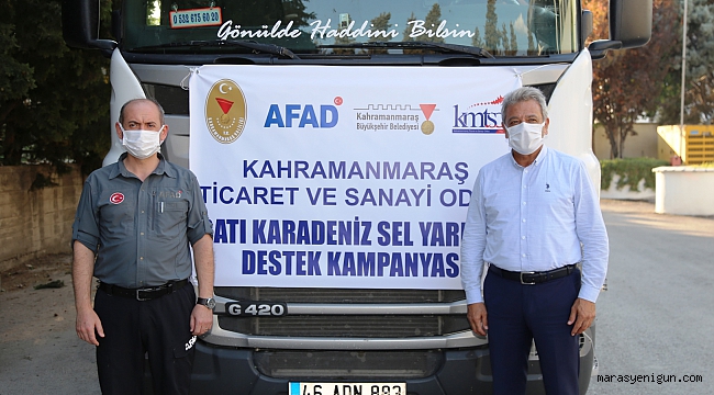Batı Karadeniz’de şiddetli yağmurun sebep olduğu sel ve su baskınları nedeniyle Kastamonu ve Sinop için Kahramanmaraş Ticaret ve Sanayi Odası (KMTSO) tarafından destekte bulunuldu. Yaşanan sel felaketinden etkilenen vatandaşlara dağıtılmak üzere KMTSO üyelerinin katkısı ile sağlanan gıda ve diğer insani yardım malzemelerinin bulunduğu yardım tırı Sinop’a doğru yola çıktı. Yardım tırını Kahramanmaraş Ticaret ve Sanayi Odası Başkan Yardımcısı Serdar Zabun ve AFAD İl Müdürü Aslan Mehmet Coşkun yolcu etti. Zabun burada yaptığı konuşmada, “Karadeniz’de gerçekleşen bu sel felaketi tüm ülkeyi yasa boğmuştur. Kahramanmaraş Valiliğimiz, Büyükşehir Belediyemiz ve Kahramanmaraş Ticaret ve Sanayi Odası’nın işbirliğiyle afetten etkilenen vatandaşlarımızın yaralarına merhem olmaya çalışıyoruz.” dedi.Kahramanmaraş Ticaret ve Sanayi Odası’nın konuyla ilgili yaptığı açıklamadaise şu ifadelere yer verildi:“Son zamanlarda ülkemizin karşı karşıya kaldığı afetlerin meydana getirdiği tahribatın ve afetlerden zarar gören vatandaşlarımızın mağduriyetlerinin bir an evvel giderilmesi için devletimiz tüm imkanlarını seferber etmiş olup son derece kapsamlı ve gayretli bir çalışma yürütülmektedir.Kahramanmaraş Ticaret ve Sanayi Odası, üyelerinin gelişimi ve kent ekonomisinin kalkınması için çaba gösterirken ülkemizde meydana gelen her türlü afet durumunda da duyarlı bir kurumsal politika izlemiştir.Cumhurbaşkanlığımızın başlattığı ve Kahramanmaraş Valiliği’nin yürüttüğü yardım kampanyasına katılım için üyelerimize çağrıda bulunulmuş ve Batı Karadeniz bölgemizde meydana gelen sel felaketi dolayısıyla üyelerimizin katkıları ile toplanacak malzemelerin afetzedelerin ihtiyaçları doğrultusunda bölgeye sevk edileceği bildirilmiştir.Yaptığımız çağrı doğrultusunda üyelerimizden gelen yardım malzemeleri afetten etkilenen vatandaşlarımıza ulaştırılmak üzere Sinop İl Afet ve Acil Durum Müdürlüğü (AFAD)’ne sevk edilmiştir.Türkiye, milleti ve tüm kurumlarıyla büyük bir devlettir. Ülkemizin bir yandan orman yangınları diğer yandan sel ve su baskınları ile mücadele ettiği bir dönemde devlet ve millet olarak birlik, beraberlik içerisinde yaraların sarılacağına inanıyoruz.Kahramanmaraş Ticaret ve Sanayi Odası olarak yaptığımız çağrıya yanıt veren ve yardım malzemesi gönderen üyelerimize teşekkür ediyoruz.Bir daha böyle acılar yaşamamak temennisi ile gerek sel gerekse orman yangınlarında hayatını kaybeden vatandaşlarımıza Allah’tan rahmet, yaralılarımıza şifa diliyoruz.”