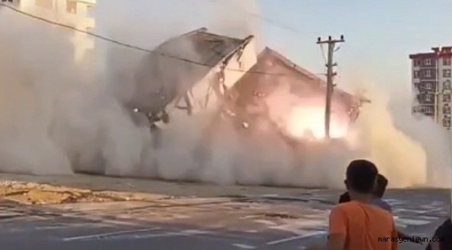 Kahramanmaraş'ta kontrollü yıkımı yapılan bina, elektrik direklerinin üzerine devrildikten sonra yola çöktü. O anlar vatandaş kamerası tarafından saniye saniye görüntülendi.