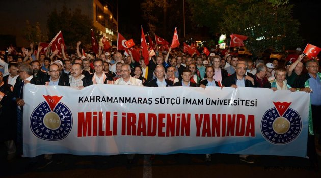 \r\n\r\nNecip Fazıl Kısakürek Kültür Merkezi önünde toplanan yaklaşık 5 bin KSÜ’lü tekbirler, marşlar, birlik ve beraberlik mesajları ile yol kenarında ve evlerinin balkonlarında bekleyen halkın destek alkışları eşliğinde Kahramanmaraş halkının ‘Milli İrade’ nöbeti tuttuğu Kent Meydanı’na yürüdü.\r\n\r\nKSÜ yöneticileri, personel ve öğrencilerden oluşan kortej, 150 metre uzunluğundaki Türk Bayrağı ile birlikte Kent Meydanı’na, Milli İrade’ye destek nöbeti tutan halkın alkışları arasında girdi.\r\n\r\nMilletin iradesini yok sayan, kalleş ve hain emelleri için demokratik olmayan yöntemlerle ülke yönetimine el koymayı amaçlayan FETÖ terör örgütüne, kalkışmanın ilk dakikalarında resmi internet sayfası üzerinden cevap veren ve seçilmiş iradenin yanında yer aldığını bildiren KSÜ yönetimi, vatan haini darbecilere karşı duruşunu Kahramanmaraş Kent Meydanı’ndan tekrar duyurdu.\r\n\r\nKahramanmaraş Sütçü İmam Üniversitesi Rektörü Prof. Dr. Durmuş Deveci, “Bu malum paralel yapı ‘amaca ulaşan her yol mübahtır’ anlayışıyla hareket ederdi. Bu millet bunlara amaca ulaşan her yolun mübah olmadığını gösterdi. Yıllar evvel ‘bu anlayış bir gün duvara toslayacak’ demiştim. Fakat bu sefer duvara değil milletin iradesine tosladılar. Millet bunlara gereken cevabı verdi.” şeklinde konuştu.\r\n\r\n“Sizler olmasaydınız, meydanlara dökülmüş olmasaydınız, milli iradeye sahip çıkmasaydınız, belki bunlar amacına ulaşacaktı.” diyen Rektör Deveci, “Bizde bir laf vardır. ‘Dinsizin hakkından imansız gelir.’ derler. Ben de bunlar için ‘Dinlinin hakkından imanlı gelecek inşallah.’ demiştim. Bu gün dinlinin hakkından imanlı geldi. Allah sizlerden razı olsun. Milli İrade’ye, yöneticilerimize sahip çıktınız.” diye konuştu.\r\n\r\nRektör Deveci, KSÜ Senatosu tarafından 16 Temmuz Cumartesi günü oybirliği ile alınan kınama kararına ilişkin metni okudu. Kınama metninde şu ifadeler yer aldı;\r\n\r\n“Ülkemiz ve Aziz Türk milleti, 15 Temmuz gecesi, geleceğine, milli birlik ve beraberliğine zarar verecek bir darbe girişimiyle karşı karşıya kalmıştır. Milletimizin en önemli kazanımlarından biri olan demokrasi, şer odakları tarafından askıya alınmaya çalışılmıştır.\r\n\r\nYüce milletimiz bu hain darbe girişimine canı pahasına göğsünü siper ederek, Çanakkale ve Milli Mücadele Ruhu ile karşı durmuş ve hainlerin emellerini boşa çıkarmıştır.\r\n\r\nDemokrasi tarihimize kara bir gece ve leke olarak geçecek bu girişimde, Gazi meclisimiz başta olmak üzere bazı kurumlarımız bombalanmış, bazı vatansever insanlarımız alçakça ve kalleşçe şehit edilmiştir.\r\n\r\nDemokrasinin en önemli savunucu unsurlarından olan üniversitelerimiz için gün demokrasiye sahip çıkma günüdür.\r\n\r\nDemokrasimize, vatanımıza ve milletimize sahip çıkma çabası esnasında hakkın rahmetine kavuşan demokrasi şehitlerimize Allah’tan rahmet, milletimize baş sağlığı, gazilerimize acil şifalar diliyoruz.\r\n\r\nAkademik camiamız, milli iradeye ve demokrasiye sahip çıkma noktasında tek vücut halindedir.\r\n\r\nYüce Yaradan vatanımızı, milletimizi, dinimizi, devletimizi her türlü tehlikeye karşı korusun. Mevlâ, yar ve yardımcımız olsun.\r\n\r\nYüce milletimizin özgür iradesine karşı düzenlenen, demokrasi tarihimize bir leke olarak geçecek bu girişimi Milli şairimiz Mehmet Akif Ersoy’un;\r\n\r\nTÜKÜRÜN, MİLLETİ ALÇAKÇA VURAN DARBELERE!\r\n\r\nTÜKÜRÜN, ONLARA ALKIŞ DAĞITAN KAHPELERE\r\n\r\ndizelerinde ifade ettiği gibi Kahramanmaraş Sütçü İmam Üniversitesi Senatosu olarak nefretle kınıyoruz.\r\n\r\n15 Temmuz 2016 Cuma akşamı ülkemizde demokrasi, insan hakları ve milli iradeye karşı yapılan darbe girişimini kınadığımızı ve seçilmiş iradenin yanında yer aldığımızı bildiririz.\r\n\r\nKamuoyuna saygı ile duyurulur.”\r\n\r\nKınama metninin Rektör Deveci tarafından okunmasının ardından Kur’an’ı Kerim tilaveti ile birlikte dualar edildi. KSÜ Rektörü Deveci ve KSÜ personeli, Kahramanmaraş Milletvekilleri, Kahramanmaraş il protokolü üyeleri, demokrasi ve mili iradeye destek nöbeti tutan Kahramanmaraş halkı ile birlikte sabahın ilk saatlerine kadar meydanlarda kalmaya devam etti.\r\n