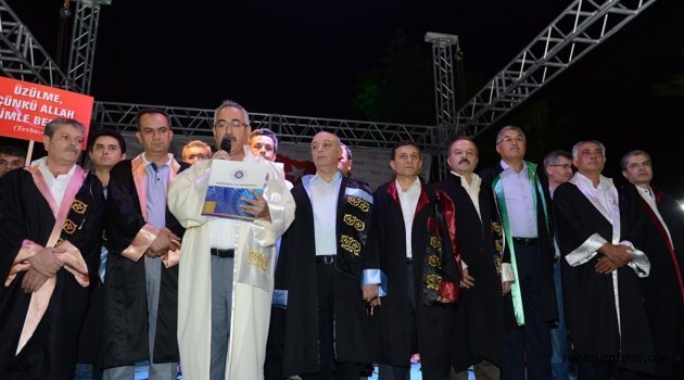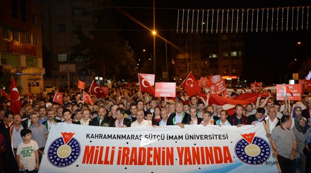 \r\n\r\nMilletin iradesini yok sayan, kendi milletine kurşun sıkan, gazi meclisi bombalayan teröristlerin darbe girişimi karşınında, ilk andan itibaren milletin yanında yer alan Kahramanmaraş Sütçü İmam Üniversitesi (KSÜ) yönetici, personeli ve öğrencileri, Rektör Prof. Dr. Durmuş Deveci öncülüğünde Demokrasi ve Millî İrade’ye destek nöbeti tutmak için yeniden meydanlara yürüdü.\r\n\r\n \r\n\r\nKahramanmaraş Müftülük Meydanı önünde toplanan yaklaşık 5 bin KSÜ’lü, mehter marşları, birlik mesajları ve darbe karşıtı pankartlar ve tekbirler eşliğinde Kahramanmaraş Kent Meydanı’na yürüdü.\r\n\r\n \r\n\r\nKahramanmaraş Sütçü İmam Üniversitesi Rektörü Prof. Dr. Durmuş Deveci, Üniversite Senatosu’nun oybirliğiyle aldığı 29.07.2016 tarih 2016/20 sayı ve 1 nolu karar metnini, demokrasi nöbeti tutan Kahramanmaraşlılarla paylaştı. İlgili kararla KSÜ Avşar Yerleşkesi 59-60 nolu parsellerde yer alan parka, FETÖ’cü teröristlerin darbe girişiminde Özel Kuvvetler Komutanlığı’na yapılan saldırıda, terör örgütü mensubu sözde komutanı alnından vuran Kahraman Şehit Astsubay Ömer Halisdemir’in adı verildi.\r\n\r\n \r\n\r\nKSÜ Senatosu tarafından Şehit Halisdemir’in adının Üniversite yerleşkesi içerisinde yer alan parka verilmesi, Kahramanmaraş Kent Meydanı’nı dolduran demokrasi kahramanlarından büyük alkış aldı.\r\n\r\n \r\n\r\n“İstiklal Şairimiz Mehmet Akif Ersoy’un, ‘Rabbim bir daha bu millete İstiklal Marşı yazdırmasın.’ dediği gibi, bizler de diyoruz ki: Rabbim bundan sonra darbeye, darbe girişimlerine dahi müsaade etmesin. Demokrasi ortamında, birbirimize saygı duyarak yaşamaya devam edelim.” diyen Rektör Deveci, Kahramanmaraşlı yetkililere seslenerek Kent Meydanı’na da Şehit Astsubay Ömer Halisdemir’in adının verilmesi önerisinde bulundu. KSÜ Rektörü Deveci’nin önerisi, meydanı dolduran binlerce Kahramanmaraşlı tarafından alkışlarla karşılandı.\r\n\r\n \r\n\r\nMeydanda kurulan platformda KSÜ yöneticileri, Demokrasi ve Milli İrade nöbeti tutan Kahramanmaraşlıları selamlarken, KSÜ İlahiyat Fakültesi Öğretim Elemanları tarafından tasavvuf musiki konseri verildi. Kur’an tilaveti ve dualarla tamamlanan programın ardından KSÜ Yöneticileri ve personelleri, sabahın ilk ışıklarına kadar demokrasi nöbetine devam etti.\r\n\r\n \r\n