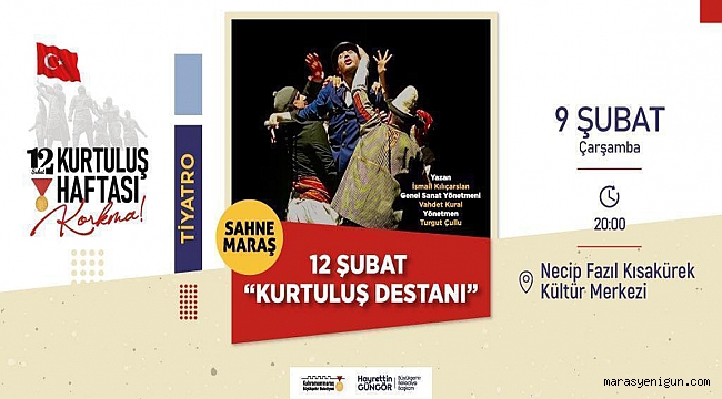 Büyükşehir Belediyesi tarafından düzenlenen Kurtuluş Haftası kutlama etkinlikleri, Sahne Maraş oyuncularının sahneleyeceği ‘12 Şubat Kurtuluş Destanı’ isimli tiyatroyla devam edecek.