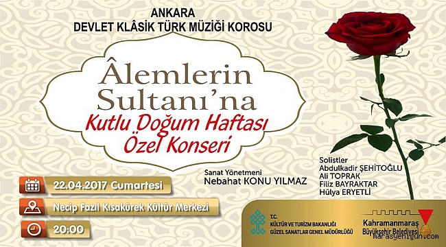 Büyükşehir Belediyesi Kültür ve Turizm Müdürlüğü’nce düzenlenen Âlemlerin Sultanı’na Kutlu Doğum Haftasına Özel musiki konserinde Ankara Devlet Klasik Türk Müziği Korosu sahne alacak.22 Nisan Cumartesi günü saat 20.00 ‘de Necip Fazıl Kısakürek Kültür Merkezinde gerçekleşecek konsere Ankara Devlet Klasik Türk Müziği Sanat Yönetmeni Nebahat Konu Yılmaz ile Solistler Abdulkadir Şehitoğlu, Ali Toprak, Filiz Bayraktar, Hülya Erteyli’nin solo olarak katılımlarıyla gerçekleşecek.