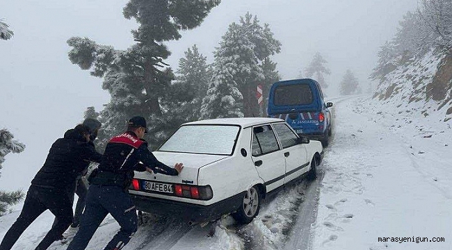 Kahramanmaraş’ın Türkoğlu ilçesinde yoğun kar yağışı nedeniyle araçları ile yolda kalan öğretmenlerin imdadına jandarma ekipleri yetişti.