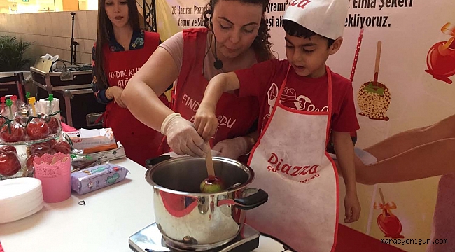 Aileleri ile alışveriş yapmak için Kahramanmaraş Piazza'ya gelen çocuklar, aşçı önlüğü ve şapkalarını giyerek elma şekerinin yapımını öğrendi.