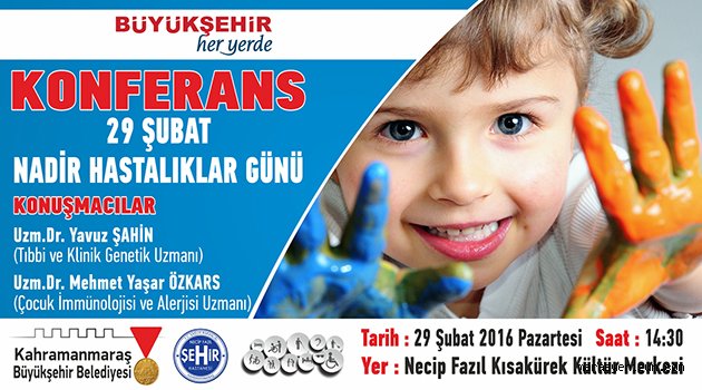 \r\n\r\nBüyükşehir Belediyesi Sağlık ve Sosyal İşler Dairesi Başkanlığı Engelliler Şube Müdürlüğü tarafından Necip Fazıl Kısakürek Kültür Merkezi’nde 29 Şubat Nadir Hastalıklar Günü münasebetiyle 29 Şubat 2016 Pazartesi günü saat 14.30’da gerçekleştirilecek konferansa çocuk sahibi aileler ve çocuk bekleyen ailelerin katılması bekleniyor.