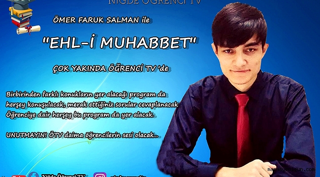 Gençlerden yeni bir program ''Ehl-i Muhabbet'' geliyor. Programın amacı herkesin merak ettiği bir çok konuya değinerek gün yüzüne çıkartmak, her zaman olduğu gibi yine öğrencilerin sesi olmak ama bu defa çok geniş kapsamlı bir şekilde geliyorlar.Ömer Halisdemir Üniversitesi Niğde Teknik Bilimler Meslek Yüksekokulu Radyo ve Televizyon Programcılığı Birinci Sınıf öğrencisi aynı zaman da bölüm başkanı Ömer Faruk Salman Niğde Öğrenci TV'de kendisinin sunup hazırlayacağı ''Ehl-i Muhabbet'' programı için hazırlıklara başladı. Program da şehirde veya okulda yani çevrede bir çok insan tarafından bilinen kişileri konuk alarak onlara herkesin merak ettiği soruları sormak ve bilinmeyenleri gün yüzüne çıkartmak. Öncelikle konuklar, program öncesi paylaşılacak ve ''Niğde İtiraf Sayfası'' ile ''Niğde Öğrenci TV'' aracılığı ile herkesin konuklara sormak istediği sorular alınacak, program da konuğa sorulacak.Salman yaptığı açıklamada;İçeriğe dair biraz daha bilgi verecek olursak, liseli kardeşlerim için farklı farklı bölümlerden arkadaşlarım ile bölümlerine dair muhabbet edeceğim. Böylelikle lise okuyan arkadaşlar, dışarıdan baktığı ile değil de bizzat bu işin içersinde yaşayan kişilerin tecrübeleri ile daha iyi kararlar verebilirler.Şehrimizde sanat adına çalışmalar yapan arkadaşlarımıza programa konuk olmaları için teklifler götüreceğim. Sanat camiasının yalnız bırakılmaması, ilgisiz bırakılmaması gerekiyor. Bunların yanı sıra esnaf abilerimiz ile bazı meslek grupları içersinde yer alan kişiler seçerek program da bir şeyler yapmayı ümit ediyorum. Umarım her şey planladığımız gibi güzel geçer.''EHL-İ MUHABBET'' NEDİR?Ehl-i Muhabbet, Osmanlıca bir kelimedir. Türkçe anlamı ''Muhabbet Sahipleri, Sevgi Ehli anlamına gelir. Bu konu ile ilgili Salman ''Benim ayrı bir Osmanlı hayranlığım, sevgim var. Bu yüzden programın ismini Osmanlıca seçmek istedim. Anlamı zaten program içeriği ile uyuşuyor. YouTube üzerinden yayınlara başlayacağız. Eğer ilgi olursa, Kültür Merkezinde programı canlı olarak yapmaya başlayabilirim'' dedi.KONUKLAR KİMLER OLACAK BELLİ Mİ? YAYIN TARİHİ NE ZAMAN?Konuklar ile ilgili bizim bir listemiz var. Hepsi ile tek tek görüşeceğim. Kabul edildikten sonra isimleri zamanla kendi sayfalarımızdan duyuracağız. Yayın tarihine ilişkin şu anda birşey söyleyemem. Çünkü ara sınav dönemi geldi. Mayıs ayından önce ilk bölümü yayınlamayı düşünüyorum.