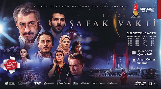 Onikişubat Belediyesi’nin konuğu olarak Kahramanmaraş halkı, 15 Temmuz hain darbe girişiminin yaşandığı tarihi geceyi anlatan "15/07 Şafak Vakti" filminin vizyona girmesiyle, 16-17-18-19 Ağustos tarihlerinde Arsan Center’da ücretsiz olarak filmi seyredilebilecek.
