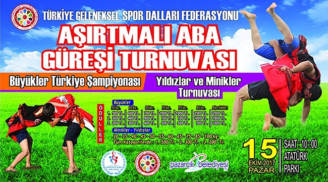 15 Ekim 2017 Pazar günü saat 10.00’da Pazarcık Atatürk Parkında gerçekleşecek olan etkinlik, Büyükler Türkiye Şampiyonası olmak üzere yıldızlar ve minikler kategorisi de turnuvada mücadele edecek. Pazarcık Belediyesi ve Pazarcık İlçe Gençlik Hizmetleri ve Spor İlçe Müdürlüğü sponsorluğunda düzenlenecek olan Türkiye Büyükler Aşırtmalı Aba Güreşi Şampiyonası hakkında açıklama yapan Pazarcık Belediye Başkanı Yakup Hamdi Bozdağ; “Bölgemizin geleneksel Güreşi olan Aşırtmalı Aba Güreşi Türkiye Yıldızlar Şampiyonasına Belediyemiz ve İlçe Gençlik Hizmetleri ve Spor İlçe Müdürlüğümüz sponsorluğunda bu yıl ilçemiz ev sahipliği yapacak.Etkinliğimiz Yıldızlar, Minikler ve Büyükler olmak üzere toplam 3 kategoride gerçekleşecek. Neden Pazarcık’ta yapılıyor? Sorusuna gelirsek; Geçmiş yıllarda ilçemize bağlı Sultanlar mahallemizde yapılan düğünlerde Aşırtmalı Aba Güreşi’ni bir etkinlik olarak yapılıyormuş. Bu vesileyle bizlerde yoğun gayretlerimiz neticesinde Pazarcık İlçe Gençlik Hizmetleri ve Spor İlçe Müdürlüğümüz ile birlikte yaptığımız istişareler sonucu Türkiye Büyükler Aşırtmalı Aba Güreşi Şampiyonası’na ilçemizde ev sahipliği yapmaya karar verdik. 15 Ekim Pazar günü saat 10.00’da Pazarcık Atatürk Parkında gerçekleşecek olan bu muhteşem etkinliğe tüm halkımızı devam ediyorum” dedi.