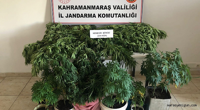 Kahramanmaraş’ın Pazarcık ilçesinde jandarma ekipleri, evlerinde kenevir bitkisi yetiştiren 2 kişiyi gözaltına aldı.Edinilen bilgiye göre, İlçeye bağlı Karagöl Mahallesinde ikamet eden M.K (40) ve L.K’nin (53) ev ve eklentilerinde kenevir bitkisi yetiştirdikleri öğrenilmesi üzerine jandarma ekipleri harekete geçti. İkametlerde yapılan aramada 234 kök kenevir bitkisi ele geçirilirken, 2 kişi hakkında yasal işlem başlatıldı.
