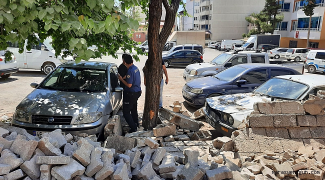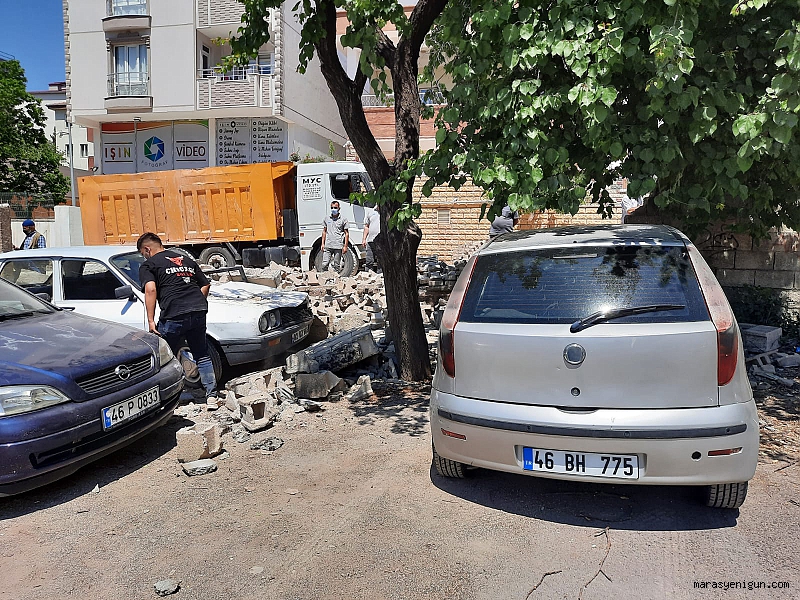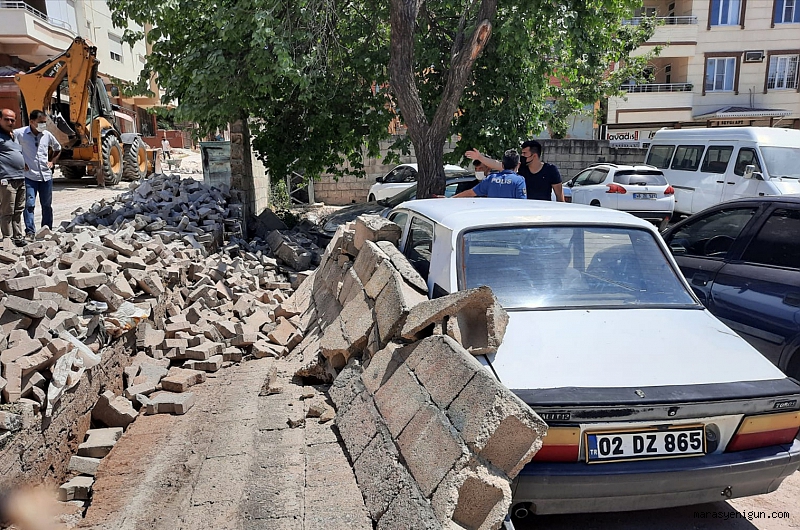 Kahramanmaraş’ın Pazarcık İlçesinde yol kenarında bulunan ihata duvarının yıkılması sonucu park halindeki 2 otomobil zarar gördü.