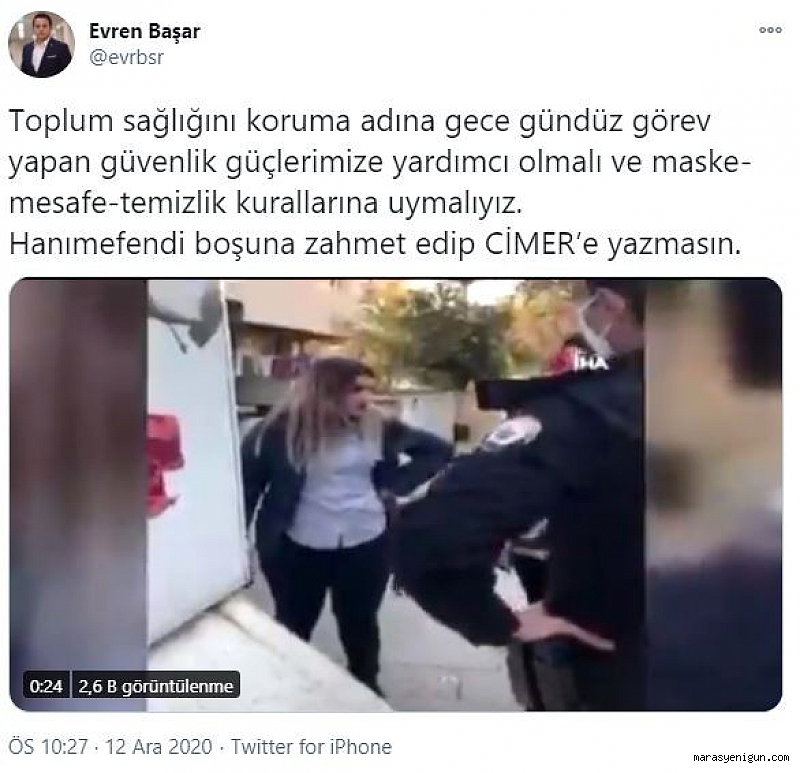 Cumhurbaşkanlığı İletişim Dairesi Başkanlığı Halkla İlişkiler Dairesi Başkanı Evren Başar, maske takmayan kadının polislere verdiği tepkinin görüntülerini sosyal medya hesabından paylaştı. İnsanların maske, temizlik ve sosyal mesafe kurallarına uyması gerektiğini ifade eden Başar, “Toplum sağlığını koruma adına gece gündüz görev yapan güvenlik güçlerimize yardımcı olmalı ve maske-mesafe-temizlik kurallarına uymalıyız. Hanımefendi boşuna zahmet edip CİMER’e yazmasın” şeklinde yanıt verdi.