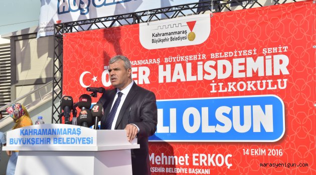 \r\n\r\nAçılış konuşmaları bölümünde kürsüye gelen Kahramanmaraş Büyükşehir Belediye Başkanı Fatih Mehmet Erkoç, 15 Temmuz’un Türkiye açısından bir dönüm noktası olduğuna işaret ederek: “Aziz milletimiz en büyük fedakârlığını, en büyük ihanetin, bu ülkeye yapılmış en büyük kötülüğün yaşandığı 15 Temmuz 2016 gecesi göstermiştir. 15 Temmuz’da aziz milletimiz, Başkomutanımız, Cumhurbaşkanımız Recep Tayyip Erdoğan’ın liderliğinde uçaklara, tanklara, bombalara karşı yüreklerini, bedenlerini ortaya koyarak kanlı darbe girişimini ve ülkemizi işgal planını boşa çıkarmış ülkemizin ve coğrafyamızın tarihini değiştirmiştir. Bu okula adını verdiğimiz Şehit Ömer Halisdemir kardeşimiz hiç düşünmeden canını hiçe sayarak darbecilere karşı mücadelesini vermiş ve darbecilerin başarılı olmasının önünü kesmiştir. 15 Temmuz’da Aziz milletimizin başarısı mazlumlara güzel bir örnek olmuştur. Biz de şehitlerimizin adını yaşatmak adına onların isimlerini ebedi kılmak adına okullarımıza veriyoruz” dedi.