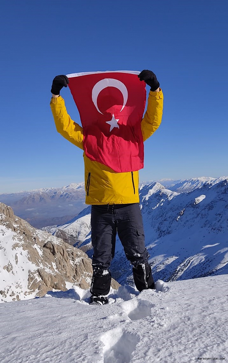 Kahramanmaraş’ın Göksun İlçesi sınırlarında yer alan 3 bin 54 rakımlı Berit Dağı’na -1 derece tırmanış yapan Dağcı Altan Mehmet Sel, “Bugün vatan ve millet sevgisine aynı kurtuluş savaşı zamanında ki gibi ihtiyacın olduğu bir zamandan geçiyoruz. Gazi ve Şehitlerimiz canını hiçe sayarak vatan hudutlarında düşmana canlarıyla siper olmuş asker ve polislerimiz için Albayrağ’ımızı göklerde onlar için dalgalandırmak istedim” dedi.