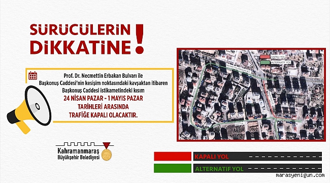 Büyükşehir Belediyesi, gerçekleştirilen altyapı çalışmaları dolayısıyla Başkonuş Caddesi ile Prof. Dr. Necmettin Erbakan Bulvarı’nın kesişim noktasındaki kavşaktan itibaren Başkonuş Caddesi istikametindeki kısmın 24 Nisan – 1 Mayıs tarihleri arasında trafiğe kapalı olacağını duyurdu. Sürücülerden alternatif güzergâhları kullanmaları istendi.Kahramanmaraş Büyükşehir Belediyesi, KASKİ Genel Müdürlüğü ekipleri tarafından OnikişubatBaşkonuş Caddesi’nde bir dizi altyapı çalışması gerçekleştiriliyor. Bu kapsamda alınan UKOME kararları doğrultusunda Prof. Dr. Necmettin Erbakan Bulvarı ile Başkonuş Caddesi’nin kesişim noktasındaki kavşaktan itibaren Başkonuş Caddesi istikametindeki kısmın 24 Nisan – 1 Mayıs tarihleri arasında trafiğe kapalı olacağı belirtildi.Ulaşım Hizmetleri Dairesi Başkanlığı’ndan alınan karara ilişkin yapılan açıklamada, “Büyükşehir Belediyesi KASKİ Genel Müdürlüğü ekipleri tarafından OnikişubatBaşkonuş Caddesi’nde bir dizi altyapı çalışması gerçekleştiriliyor. Çalışmalar kapsamında, trafikte meydana gelebilecek aksamalara mahal vermemek adına sürücülerin alternatif güzergâhları tercih etmeleri önem arz etmektedir” ifadelerine yer verildi.