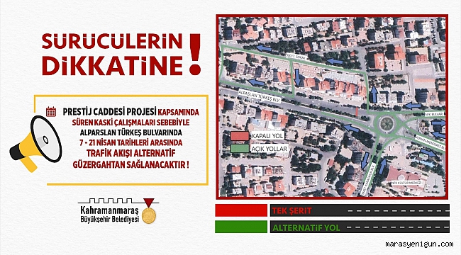 Büyükşehir Belediyesi, gerçekleştirilen altyapı çalışmaları dolayısıyla Alparslan Türkeş Bulvarı ile İsmet Karaokur Bulvarı’nın kesişim noktasından Alparslan Türkeş Bulvarı istikametindeki 100 metrelik kısmın 21 Nisan tarihine kadar trafiğe kapalı olacağını duyurdu. Sürücülerden alternatif güzergâhları kullanmaları istendi. Kahramanmaraş Büyükşehir Belediyesi, KASKİ Genel Müdürlüğü ekipleri tarafından Alparslan Türkeş Bulvarı’nda başlatılan altyapı çalışmaları hız kesmeden devam ediyor. Bu kapsamda alınan UKOME kararları doğrultusunda Alparslan Türkeş Bulvarı ile İsmet Karaokur Bulvarı’nın kesişim noktasından Alparslan Türkeş Bulvarı istikametindeki 100 metrelik kısmın7 – 21 Nisan tarihleri arasında trafiğe kapalı olacağı belirtildi. Ulaşım Hizmetleri Dairesi Başkanlığı’ndan karara ilişkin yapılan açıklamada, “KASKİ Genel Müdürlüğü ekipleri tarafından Alparslan Türkeş Bulvarı’nda başlatılan altyapı çalışmaları devam ediyor. Trafikte meydana gelebilecek aksamalara mahal vermemek adına vatandaşlarımızın alternatif güzergâhları tercih etmeleri önem arz etmektedir” ifadelerine yer verildi.