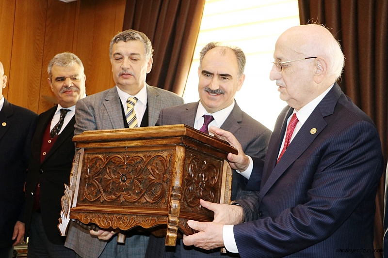 Burada valilik şeref defterini imzalayan Kahraman, Vali Vahdettin Özkan’a çeşitli hediyeler takdim etti. Vali Özkan da Kahraman’a Kahramanmaraş’a özgü el sanatlarının başında yer alan sandık hediye etti.
