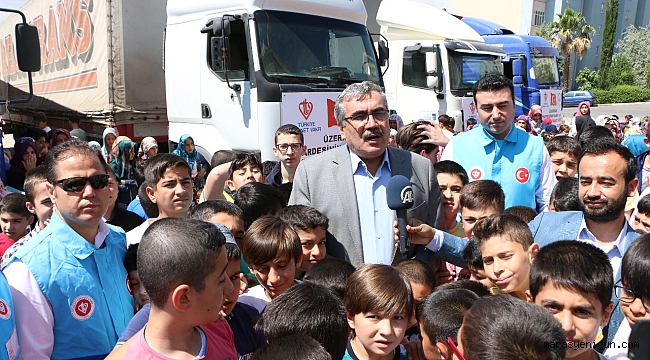 “Üzerinde Kardeşinin Hakkı Var” yardım kampanyasıyla Suriye'nin Azez kentine gönderilen 4 insani yardım Tır’ını çocuklar dualarla uğurladı.Dulkadiroğlu İlçesi Doğukent Camii önünden hareket eden 4 Tır dolusu Un çocukların da aralarında bulunduğu bir programla Suriye'nin Azez kentine gönderildi.Kahramanmaraş İl ve İlçe Müftülükleri ile Türkiye Diyanet Vakfı Şubesi Suriye ’deki mazlumlar ve mağdurlar için bir araya gelerek, Azez ve Halep’te yaşananlara seyirci kalmayarak açılan kampanyaya öncülük ediyor.Programda Tır’ları Azeze; İl Müftüsü Celal Sürgeç, Onikişubat İlçe Müftüsü Abdullah Demir, Dulkadiroğlu İlçe Müftüsü Davut Polat, Türkoğlu İlçe Müftüsü Abdüssamed pat, Türkiye Diyanet Vakfı Şube Müdürü Emre Taşdemir ile Doğukent halkı ve Doğukent camii Yaz Kur’an Kursu öğrencileri uğurladı.Kahramanmaraş İl Müftüsü Celal Sürgeç, Savaştan etkilenen halkın yaralarını bir nebze olsa sarmak için başlattıkları yardım çalışmaları kapsamında toplanan 100 ton un’un Kahramanmaraş'tan 4 tırla yola çıktığını belirtti. Fırat Kalkanı operasyonunun ardından güvenli bölgeye bu yardımların gönderildiğini hatırlatan Müftü Sürgeç, Hayırseverlerin destekleriyle hazırlanan yardımları vakit kaybetmeden Suriyeli kardeşlerimize teslim edileceğinin altını çizdi şöyle devam etti: “Çok kıymetli mesai arkadaşlarım ve sevgili yavrularım. Diyanet İşleri başkanlığımızın Her canın Üzerinde kardeşinin hakkı vardır temasından hareketle bu ramazan’da özellikle mağdur olan, mazlum olan her insanın yanında yer almak ve yanında olmak için ve özellikle Fırat kalkanı kapsamında buluna İllere yardım için Un kampanyası düzenledik. Bu kampanyaya sağ olsun İlçe Müftülerimizin katkısıyla 4 Tır yüklendi. İnşallah bu Tırları mağdur insanlara buradan yapacağımız dualarla uğurluyoruz. Bizler Anadolu insanı, bu coğrafyanın insanı olarak hiç mazluma duyarsız kalamayız. Zaten bundan dolayı buraya Anadolu denilmiş. İnsan sıkıştığı zaman, daraldığı zaman nasıl ki, anasına sığınır ise bu coğrafyada içinde bulunduğumuz bu vatanımızda insanlığın anasıdır. Bizde ana olmanın gereğiyle kardeşlerimize el uzattık. Her canın üzerimizde hakkı vardır. O hak sahibine haklarını verelim diyoruz. Buradan 4 Tır 100 ton un yardımını Çocuklarımızın duasıyla gönderiyoruz.”şeklinde konuştu.Daha sonra Doğukent Camii Kuran Kursu öğrencilerinden iki kız çocuğu ve ardından, Onikişubat İlçe Müftüsü Abdullah Demir’in duasıyla 4 Tır Suriye’nin Azez şehrine doğru yola çıktı.HABER-KAMERA: HACI ALİ GÜNEÇIKAN