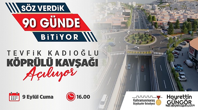 Büyükşehir Belediyesi tarafından hayata geçirilen Tevfik Kadıoğlu Köprülü Kavşak projesinin açılış gerçekleştirilecek. Başkan Hayrettin Güngör, “Tevfik Kadıoğlu Köprülü Kavşak projemizi hedeflediğimiz süre içerisinde tamamlayarak hemşehrilerimizin hizmetine sunuyoruz. İnşallah 9 Eylül Cuma günü projemizin açılışını gerçekleştireceğiz. Açılışımıza tüm hemşehrilerimiz davetlidir” dedi.Kahramanmaraş Büyükşehir Belediyesi, hayata geçirdiği dev ulaşım yatırımlarıyla şehrin katma değerini artırmayı sürdürüyor. Bu kapsamda, 10 Haziran tarihinde temeli atılan ve tamamlanması için 90 günlük süre belirlenen Tevfik Kadıoğlu Köprülü Kavşak projesinin açılışı gerçekleştirilecek. Hedeflenen süre içerisinde tamamlanarak hizmete alınacak projeyle şehir merkezinin trafik yoğunluğu büyük ölçüde hafifleyecek. 9 Eylül Cuma günü saat 16.00’da gerçekleştirilecek açılış törenine tüm vatandaşlar davet edildi.Söz Verdiğimiz Sürede Hizmete AlıyoruzTevfik Kadıoğlu Köprülü Kavşak projesinin açılış törenine tüm vatandaşları davet eden Büyükşehir Belediye Başkanı Hayrettin Güngör, “Şehrimizin doğusu ile batısını birbirine kesintisiz bağlayacak ve Yedikuyular Kayak Merkezi’ne doğrudan ulaşım sağlayacak Tevfik Kadıoğlu Köprülü Kavşak projemizi hedeflediğimiz süre içerisinde tamamlayarak hemşehrilerimizin hizmetine sunuyoruz. İnşallah 9 Eylül Cuma günü saat 16.00’da projemizin açılışını gerçekleştireceğiz. Programımıza tüm hemşehrilerimiz davetlidir” ifadelerini kullandı.