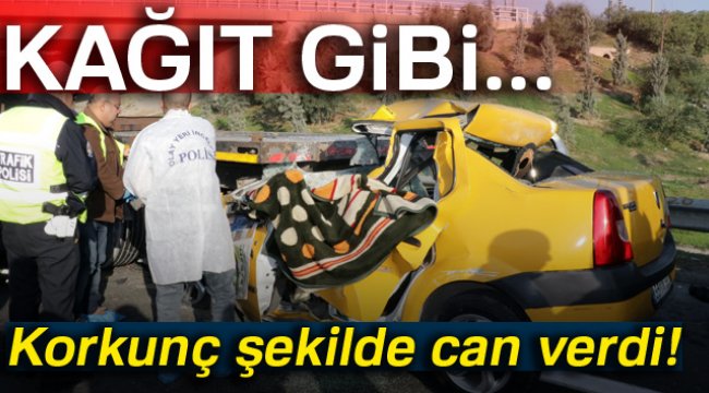 Kaza, sabah saatlerinde İzmir Çevreyolu Otogar Kavşağında meydana geldi. Edinilen bilgilere göre, Mustafa Akyürek (32) idaresindeki 35 T 6352 plakalı ticari taksi, emniyet şeridinde bulunan Mustafa Demirer (46) idaresindeki 35 VF 671 plakalı tıra arkadan çarptı. Kazayı gören diğer sürücüler durumu hemen 112 acil sağlık, 110 AKS ve polis ekiplerine bildirdi.Olay yerine gelen sağlık ekipleri yaptıkları kontrolün ardından Akyürek’in hayatını kaybettiğini belirledi. Bekar olduğu öğrenilen Akyürek’in cansız bedeni savcılık incelenmesinin ardından AKS ekipleri tarafından sıkıştığı yerden çıkartılarak İzmir Adli Tıp Kurumu Morguna kaldırıldı. Kazada geçirdiği şok nedeniyle tır sürücüsü Ege Üniversitesi Tıp Fakültesi Hastanesine kaldırılırken, kazada tırın emniyet şeridinde durup durmadığı ise yapılacak inceleme sonrası netlik kazanacak. Abdülaziz Baydilli - Halil İbrahim Karabıyık - Sinan Yeniçeri