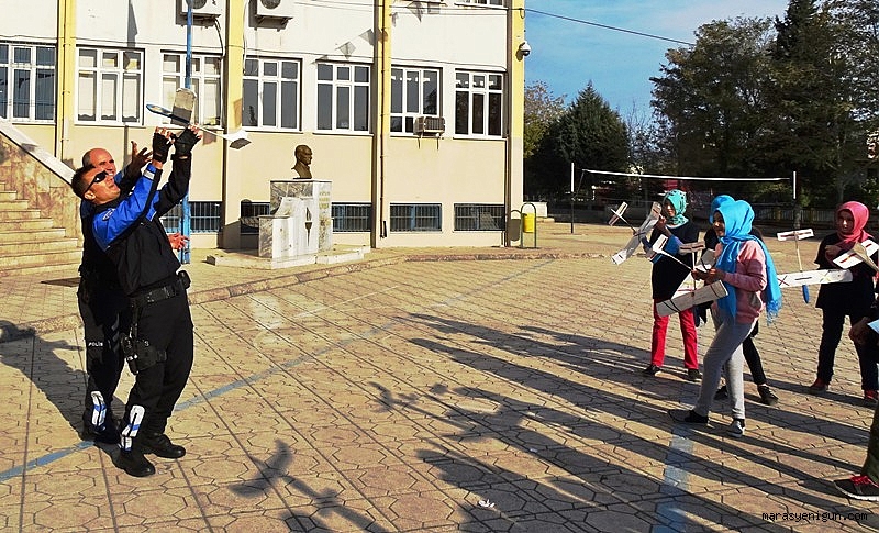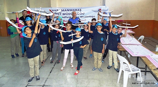 Kahramanmaraş Beylerbeyi Ortaokulu'nda eğitim gören 30 öğrenciye 2 grup halinde ‘Türk Hava Yolları Türkkuşu Ataplanör Modeluçağı’ yapımını öğreten polisler, eğitim sonunda çocuklarla birlikte hazırlan uçakları uçurdu.