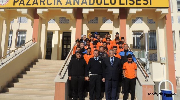 \r\n\r\nPazarcık İlçe Emniyet Müdürlüğü Toplum Destekli Polis Büro Amirliği ekipleri kapı kapı dolaşıp, apartman giriş kapılarına, iş yerlerinin girişleri ve bankamatiklerin üzerlerine hırsızlara karşı vatandaşlara uyarıcı broşür yapıştırıyor ve broşür dağıtıyor.\r\n\r\nPazarcık İlçe Emniyet Müdürlüğü Toplum Destekli Polis Birimi ekipleri, 'Güvenli bir hayat ve güvenli bir gelecek için polis halk el ele, Pazarcık'ta daha huzurlu günlere' adlı broşür dağıtarak vatandaşı bilgilendirdi. İlçe Emniyet Müdürlüğü yetkilileri, esnaf ve vatandaşlara, "İşyerinizde çarşı, pasaj veya içersindeyse özel güvenlik görevlisi bulundurulmasını sağlayın. İşyeri kapı ve camlarına içeriye görmeyi engelleyecek şekilde resim poster vb asmayın işyerinize kepenk taktırın mümkünse işyerinize uygun alarm taktırın. Çok sayıda müşteri aynı anda geldiğinde kişiler üzerinde hırsızlığa karşı dikkatli olun. Güvenlik kamerası çok etkili ve caydırıcı bir önlemdir. İşyerinize kamera sistemi mutlaka taktırmaya çalışın. Apartmanlarınızın ana giriş kapısına açık bırakmayınız. Kapı zili çalıp makul olmayan bir sebeple içeri girmek isteyen yabancılara kapı açmayın. Hırsızlar eve girdiklerinde önce yatak odasını karıştırır kıymetli eşyalarınızı daha değişik yerlere saklayınız ve şüpheli her durum 155 polis imdat'ı arayın" dedi.\r\n\r\nMahalle mahalle evleri dolaşmayı hedeflediklerini belirten polis ekipleri, vatandaşların apartman kapılarını açık bırakmamalarını ve tanımadığı kişilere apartman kapısını açmaması gerektiğini dikkat çekiyorlar. Apartmanlarda karşılaştıkları vatandaşları sözlü olarak da hırsızlık konularında çeşitli uyarılarda bulunan polis ekipleri, vatandaşların her hangi bir şüpheli durumda 155 polis imdadı aramalarını istediler. Toplum destekli polislerin ev ve işyerlerine bıraktıkları uyarı broşürlerinin üzerinde "Çevrenizdeki olaylara gözünüzü kapatmayın. Can ve mal güvenliğiniz için kapınızı açık bırakmayınız. Emin olmadan kapıyı açmayınız, Güvenliğiniz için işyerlerinize ve evlerinize güvenlik kamerası taktırınız ve 155 polis imdat" yazıları bulunuyor.\r\n\r\n \r\n
