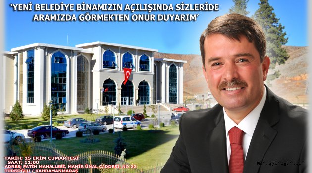 \r\n\r\nAçılış hakkında konuşma yapan Türkoğlu Belediye Başkanı Osman Okumuş; Göreve geldiğimiz ilk gün, en büyük eksikliklerimizden biri olan ve aynı zamanda yıkım kararı verilen eski belediye hizmet binamızın yerine, ilçemiz Fatih Mahallesi, Mahir Ünal Caddesi üzerinde bulunan 8 dönümlük alan içerisine modern yeni belediye hizmet binasını tamamladık,geçtiğimiz Pazartesi gününden itibaren yeni hizmet binamızda hizmet vermeye başladık, diyerek konuştu.\r\n\r\n'BELEDİYE BİNALARI BİR İLÇENİN VİTRİNİDİR'\r\n\r\nTürkoğlu’nun şanına yakışır belediye binamızın açılışını 15 Ekim 2016 Cumartesi saat 11:00’da gerçekleştireceğiz diyerek konuşan Başkan Okumuş; Belediye binaları bir ilçenin vitrinidir. Oralar belediye başkanlarının, meclis üyelerinin kaldığı yerler değildir. Bu binayı yapmamızın gayesi Türkoğlu’muzun onuruna şanına ve 70 bin nüfusuna yakışacak belediye binası yapmak. Orası Türkoğlu'lu vatandaşlarımızın gurur kaynağı bunun içinde Osmanlı motifli, Selçuklu mimarisinden önümüzdeki 50 yıla hitap edecek güzel bir eser kazandırdık, diyerek sözlerine şöyle devam etti.\r\n\r\n'AÇILIŞIMIZA TÜM HALKIMIZ DAVETLİDİR'\r\n\r\nBu vesile ile tüm Kahramanmaraş ve Türkoğlu’lu hemşehrilerimi ilçemize yakışacak yeni Belediye Hizmet Binamızın açılışına davet ediyorum, Dedi\r\n\r\n \r\n