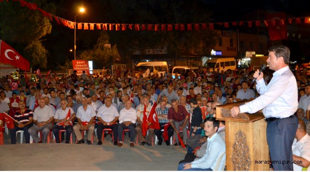 \r\n\r\n Binlerce Türkoğlulu Kent Meydanı’nda demokrasi nöbeti tutmaya devam ederken, Türkoğlu Belediye Başkanı Osman Okumuş tarafından tüm nöbet tutan vatandaşlara bayrak dağıtımı yapıldı.\r\n\r\n İlçedeki farklı siyasi görüşlerden vatandaşlar Türk bayrakları ile tüm dünyaya birlik mesajı verdi.\r\n\r\nDemokrasi şehitleri için okutulan mevlide; Türkoğlu Kaymakamı Serdar Kartal, Türkoğlu Belediye Başkanı Osman Okumuş, AK Parti Türkoğlu İlçe Başkanı Mehmet Ali Şen, İlçe Emniyet Müdürü Selahattin Öztırpan, STK temsilcileri ve binlerce vatandaş katıldı.\r\n\r\nTürkoğlulular, sabaha kadar demokrasi nöbetine devam ederken Türkoğlu Belediye Başkanı Osman Okumuş konuşmasında;Vatanı için milleti için gerekirse ölürüz diyen, eğilmeyip dik duran sabahlara kadar nöbet tutan Türkoğlu’muzun güzide vatandaşlarım programımıza hepiniz hoş geldiniz şerefler verdiniz. Öncelikle milli mücadelede kahramanlık yazan Türkoğlu’lu vatandaşlarımızın torunu olan direnişin sembolü olan özel kuvvetler mensub değerli Niyazi Kardeşimin şehitlik mertebesine ulaşmasından dolayı kendilerine Allah’tan rahmet diliyorum, ailesine başsağlığı, kederli ailesine ve Türkoğlu halkımıza da sabırlar diliyorum. Darbe girişiminin olduğu ilk dakikalardan itibaren Reisimizin evde yatma vakti değil herkesi sokaklara davet ediyorum çağrısından sonra, bizde Türkoğlulular olarak sokaklardayız, meydanlardayız, sabahlara kadar binlerce vatandaşlarımızla buradayız.\r\n\r\n ‘TÜRKOĞLU EN GÜZEL BİRLİK MESAJI VERMEKTE’\r\n\r\n Vatanımıza hep birlikte sahip çıkacağız. Rabbim bizi Başta Peygamber Efendimiz (Sav) olmak üzere, tüm şehitlerimizin şefaatine nail etsin inşallah, Bu vatan bizim, bir avuç çapulcuya bırakamayız. Gün birlik olma günüdür. Türkoğlu bu konuda çok güzel mesajlar vermektedir. Demokrasi nöbetimiz devam edecektir. 15 Temmuz yapılan darbe girişiminde canını seve seve bu vatan için veren tüm şehitlerimizi yad ediyor; onları asla unutmayacağımızı bir kez daha buradan haykırıyoruz. Gazilerimize de acil şifalar diliyorum, dedi.\r\n\r\n Türkoğlu Kaymakamı Serdar Kartal ise konuşmasında; “Bugün görüyoruz ki bizim Milletimiz sivil toplum olarak MHP'lisi, CHP'lisi ve AK Partilisiyle parti ayrımı gözetmeksizin milleti ve devleti söz konusu olduğunda, kendini, canını devletine ve milletine siper edebiliyor. Bu gün bizi Avrupa Birliğine almak istemeyenler ülkemize yapılan yatırımları çeşitli bahanelerle önüne engeller çıkarmak isteyenler hep milletimizin önüne geçmek için engeller çıkarıyorlar. Milletimizin kaynakları ile yapılan yollar, köprüler, kendi milli parklarımız, uçaklarımız, gemilerimiz ve bir çok başarılarımız birilerini rahatsız etti. Millet olarak bunlara boyun eğmeyip gerekli dersi vereceğiz, diyerek konuştu, diyerek konuştu.\r\n\r\nMevlit programı sabahın ilk ışıklarına kadar devam etti.\r\n\r\n \r\n