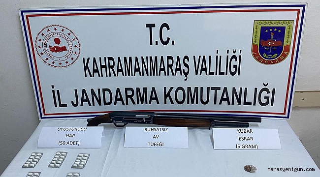 Edinilen bilgiye göre, İl Jandarma Komutanlığı ekipleri, M.D. (28) ve İ.D’nin (34) Gaziantep’ten temin ettiği uyuşturucu maddeleri Kahramanmaraş’a getireceği bilgisi üzerine operasyon yaptı. Jandarma ekipleri tarafından durdurulan otomobilde yapılan aramada, koltuk altına gizlenmiş vaziyette 1 adet ruhsatsız av tüfeği ile 50 adet uyuşturucu hap ve 5 gram kubar esrar maddesi ele geçirdi. Uyuşturucu maddelere el koyan ekipler 2 kişiyi gözaltına alarak, hakkında yasal işlem başlattı.