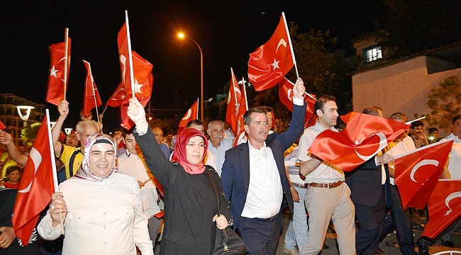 ilçe Kaymakamı Mustafa Nevzat Mercan, İlçe Jandarma Komutanı Ümit Karademir, Belediye Başkanı Osman Okumuş, Cumhuriyet Başsavcısı Mehmet Kurt, AK Parti ilçe başkanı M.Ali Şen, STK temsilcileri ve çok sayıda vatandaşların katılımıyla ‘Demokrasi Nöbeti’ tutuldu.FETÖ terör örgütünün darbe girişiminin ikinci yıldönümü münasebeti ile Türkoğlu Kent Meydanı’nda düzenlenen ’Demokrasi nöbeti’, saygı duruşu, istiklal marşı ve Kuran-ı Kerim tilavetinin ardından darbe girişimindeki o hain gecede milletimizin gösterdiği destansı kahramanlıklarla ilgili videolar Meydanlara kurulan ekranlardan sinevizyon ve slayt gösterileri ile geç saatlere kadar izletildi.Başta ilçedeki 15 Temmuz Şehidi olan Niyazi Ergüven olmak üzere tüm şehitleri rahmetle anan Türkoğlu Belediye Başkanı Osman Okumuş konuşmasında;Şehitlerimiz kıyamete kadar artık unutulmayacak. Aileleri de onların bir emaneti. Hainler bu şehitlerimiz gazilerimiz ve o gece sokaklara inen milyonların sayesinde emellerine ulaşamadılar. Bizi hem içimizden vurmuşlar hem arkamızdan. Kendimizden saydığımız, kardeşimiz dediğimiz, bizimle beraber camiiler de namaz kılan, askere giden, mücadele veren insanları içimizde yetiştirmişler ve arkamızdan hep bu insanlar hançerlemiş. Geçmişte bu tarihi kitapları okuduğumuz zaman bunu görürüz. Tarih tekerrürden ibaret diyoruz, bu tekerrürlerden hepimizin ders çıkarması gerekiyor. Beynimizi, aklımızı ne olur başkalarının, başka insanların, başka üyelerin emrine vermeyelim. Cumhurbaşkanımızın her zaman söylediği gibi vatanını, milletini, devletini, bayrağını seven gerçekten liyakat sahibi insanlara güvenelim, onlarla hareket edelim. Çünkü; tarih tekerrürden ibarettir diyoruz ama FETÖ gibi alçak bir şebekenin yaptığı bu 15 Temmuz darbe girişimi ilerleyen yıllarda da başka şekilde tezahür edecektir. Bunun için uyanık olmamız lazım.248 tane şehidimiz var. Bir parti çıkıyor diyor ki; ‘Kontrollü darbe girişimi bu’. Allah aşkına bir vatanını, milletini seven bir Cumhurbaşkanı bir Başkomutan 248 tane vatan evladını vermek ister mi?Türkiye’miz her alanda olduğu gibi askeri alanda güçlü olması lazım. İnsanlarıyla, birlik beraberlikleriyle, kaynaşmalarıyla, birbirimizi desteklememiz lazım her zaman için. Mezhepsel olsun, ideolojik olsun, etnik olarak ayrımcılığa kesinlikle müsaade etmeyeceğiz. 81 milyon insan vatanını devletini milletini bayrağını seven insanlar olmamız lazım bunun için mücadele vermemiz lazım. Çünkü; Türkiye’nin diğer ülkelerdeki mazlum insanlara da, mazlum insanlarında Türkiye‘ye ihtiyacı var. Bu vesileyle bu alçakça FETÖ kalkışmasını yapan, alçak FETÖ’nun başında bulunan ve şuanda Amerika da bulunan FETÖ ele başının bir an evvel Türkiye’ye getirilip inşallah idam edilmesini ve bununla beraber olan insanlarında en ağır şekilde yargılanmasını istiyoruz. Diyerek konuştu.Kahramanlar diyarı Kahramanmaraş’ta böyle bi günü idrak etmekten ötürü size mutluluklarımı iletiyorum diyerek konuşmasına başlayan İlçe Kaymakamı Mustafa Nevzat Mercan ise konuşmasında; Bizim hayata dair en büyük güvencemiz hala bu ülke için canını verebilecek kahramanlara sahip olmamızdır. Kahramanmaraş ve Türkoğlu bu konuda ülkemizde önde gelen diyarlardan biridir. Bizim sizden en büyük beklentimiz aklınızı ve vicdanınızı kimseye kiraya vermemenizdir. Neden ve nasıl sorusunu herkese sormanızdır. Çünkü ihanet edenler her zaman bizim aklımızı ve vicdanımızı kullandılar. Her zaman saf duygularımızı kullandılar buna karşı uyanık olmak zorundayız unutursak her ihanet tekrarlanır. E muhtıra ile denediler olmadı, Geziyle denediler olmadı bunların hepsini unuttuk. En son 15 Temmuz ile denediler ne diyordu rahmetli Aliye Izzetbegoviç ben soykırımı affetmenizden değil, soykırımı unutmanızdan korkuyorum. Bizlerde bu ihaneti asla unutmayacağız VE unutturmayacağız, diyerek konuştu.Program, Türkoğlu Belediyesinin ikramları, vatandaşlarla birlikte tekbirler ve sloganlarla Demokrasi yürüyüşü sonrasında ise yapılan dualarla gece geç saatlerde sona erdi.