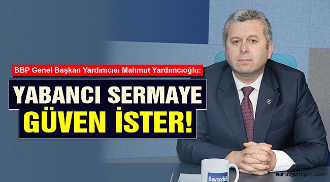 Büyük Birlik Partisi (BBP) Genel Başkan Yardımcısı Mahmut Yardımcıoğlu, Türkiye’nin ciddi anlamda yabancı sermaye ihtiyacı olduğunu belirterek; yabancı sermayenin güven ortamını sevdiğini söyledi.