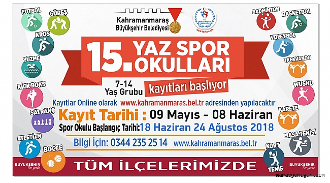 Kahramanmaraş Büyükşehir Belediyesi tarafından bu yıl 15.’si düzenlenecek Yaz Spor Okulları’nın açılış tarihleri belirlendi.Onikişubat ve Dulkadiroğlu İlçelerine hizmet verecek merkez Yaz Spor Okulu açılışı 29 Haziran 2018 Cuma günü saat 18.00’de 12 Şubat Stadyumu’nda gerçekleştirilecek.Toplamda bu yıl 11 bin öğrencinin kayıt yaptırdığı yaz spor okullarının ilçelerdeki açılış tarihleri ise şöyle:2 Temmuz 2018 Pazartesi Andırın İlçesi saat 12.00’de Andırın Spor Salonu, Afşin İlçesi saat 15.00’de Afşin Spor Salonu, Elbistan İlçesi saat 17.00’de Elbistan Gençlik Merkezi Tesislerinde yaz spor okullarının açılışı yapılacak.3 Temmuz 2018 Salı günü Çağlayancerit İlçesi saat: 11.30’da Suni Çim Saha, Pazarcık İlçesi Saat: 14:30Pazarcık Spor Salonu ve Türkoğlu İlçesi Saat: 17:00’de Türkoğlu Spor Salonunda yaz spor okullarının açılışları yapılacak.4 Temmuz 2018 Çarşamba günü Nurhak İlçesi saat 12.00’de Nurhak Spor Salonu, Ekinözü İlçesinde saat 14.00’te Ekinözü Yunus Emre Ortaokul halı sahası ve Göksun İlçesi saat 16.00’da Göksun Spor Salonu’nda yaz spor okullarının açılışları yapılacak.