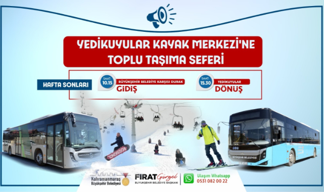 Kahramanmaraş Büyükşehir Belediyesi, bölgenin en popüler kış turizm destinasyonlarından biri olan Yedikuyular Kayak Merkezi’ne ulaşımı kolaylaştırmak amacıyla yeni bir toplu taşıma hizmeti başlatıyor. 4 Ocak Cumartesi günü başlayacak olan bu hizmet, kayak ve doğaseverler için büyük bir kolaylık sağlayacak. Toplu taşıma seferleri, hafta sonlarına özel olarak düzenlenecek. Cumartesi ve Pazar günleri şehir merkezi ile Yedikuyular Kayak Merkezi arasında çift yönlü hizmet sunulacak. Seferler, saat 10.15’te Büyükşehir Belediyesi karşısındaki otobüs durağından başlayacak. Kayak ve doğa keyfi yaptıktan sonra dönüş yapmak isteyen vatandaşlar için ise otobüsler saat 15.30’da Yedikuyular Kayak Merkezi’nden geri dönecek.